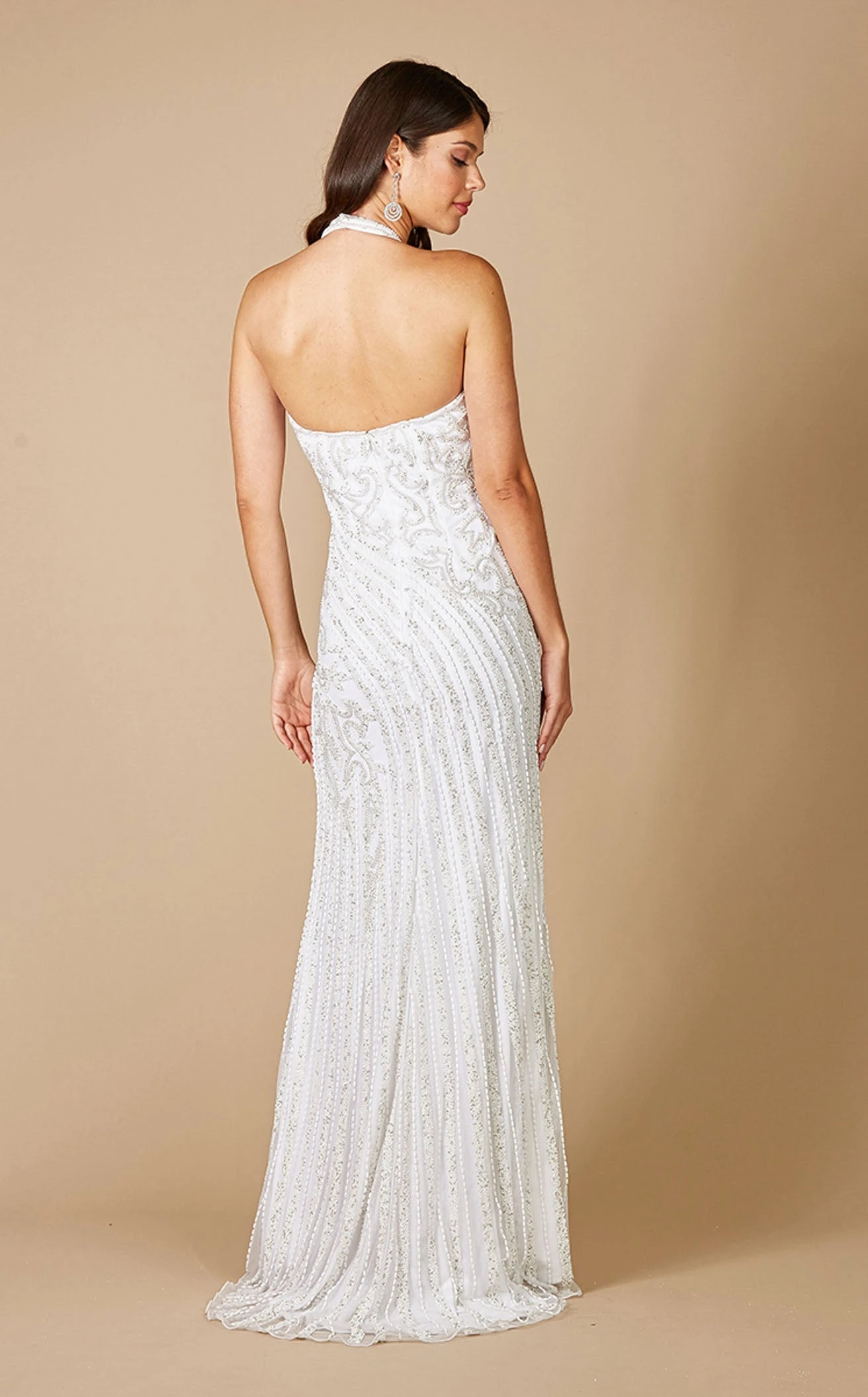 Capture the spotlight in this curvy evening gown by Lara. The halter bodice features a classic jewel neckline and cutout shoulders. Dressmaker lines define the curves of bust, midriff and hips, while tone-on-tone beading provides posh embellishments. Curved designs adorn the svelte skirt, and a sizzling split supplies an eye-catching accent along the flared full-length.