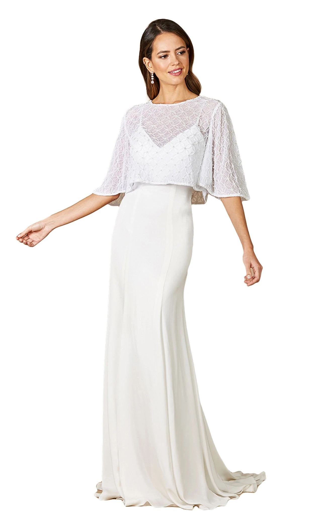 This classic Lara gown makes you stand out. In this long dress, the illusion cape gives you that fierce, bold look. This dress has an open back and a showcasing halter neckline. A full-length sheath silhouette with a back zipper closure follows. In this graceful evening gown, you’d look effortlessly fabulous.