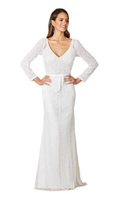 Wear this Lara evening gown to get that glamorous feeling. In a lace appliqued and beaded bodice, this long sleeve, the lacy gown features a V-neckline and a waist belt. This dress has a sheath silhouette and an illusion back with a V-cut and back zipper closure. At your next event, this stunning gown would be the center of attention.