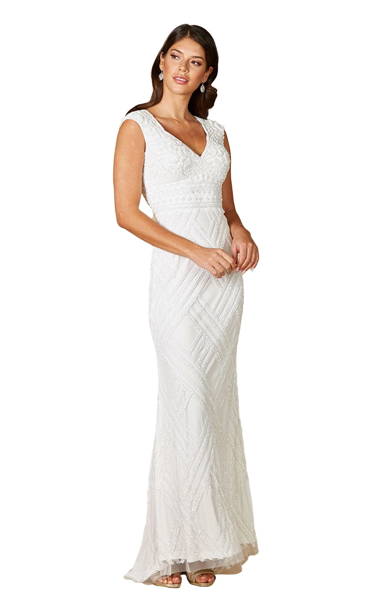 Define those exquisite curves in a flattering way by wearing this evening gown from Lara. The V-neck of this lace gown is complemented by a sleeveless bodice. The fitted bodice and floor-length skirt are embellished with beads and embroidery. It has a closed-back with a back zipper that makes it very comfortable to wear. This Lara evening gown makes you look lovely.