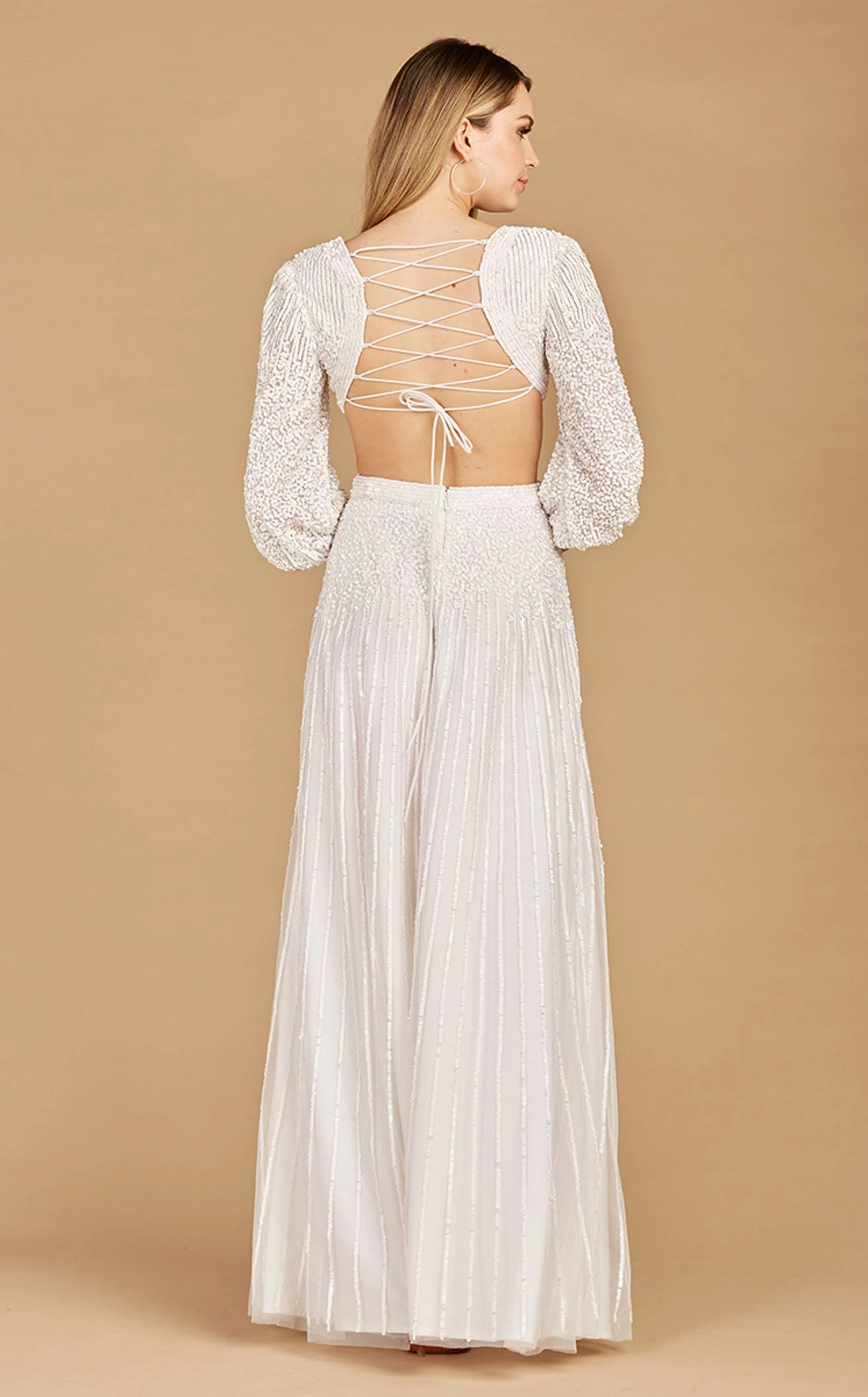 Walk through the aisle wearing this gorgeous A-line wedding dress designed by Lara 51119. Fashioned with a stellar V-neckline and long beaded sleeves, the long dress offers an amped-up stylish look when paired with elegant earrings and high heels. Triangular cut-outs on the front and a lace tie-up closure on the back are perfect to flaunt your sharp features. A zipper on the back offers ease while wearing.