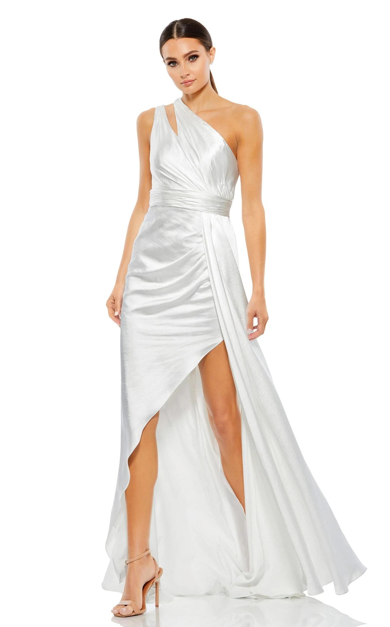 Say yes to this graceful and ravishing design crafted by Mac Duggal 49006. The dress boasts an asymmetrical neckline with cutout detail. The monochromatic fabric belt cinches the waist. The dress shows off an asymmetrical hemline, longer from the back and shorter from the front. A pleated floor-length fabric from the waist at one side makes this dress unique.
