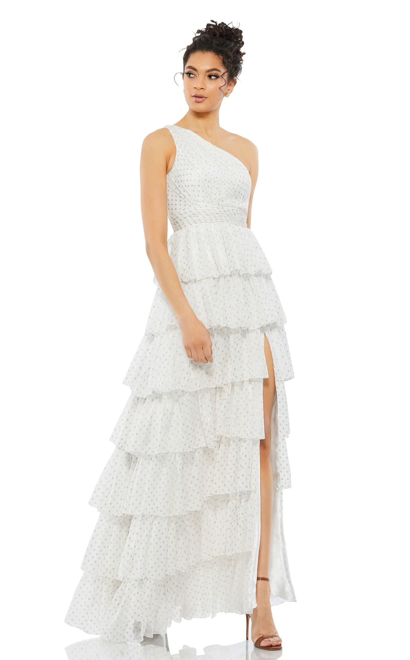 Make your partner go weak in his knees wearing this fetching dress by Mac Duggal 49512. A simple yet sophisticated choice for events, the dress is wrapped in polka dots. Its fitted bodice with an asymmetrical neckline paves way for a cinched waistline. The A-line skirt with ruffle tier detailing displays a high slit, shifting a bit of focus on your legs.