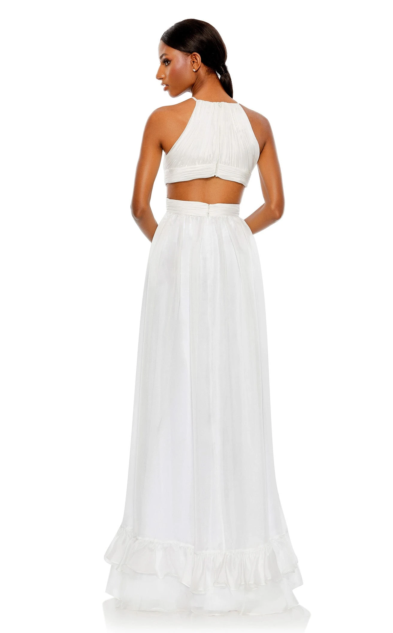 Take a powerful walk every time you wear this long and beautiful dress by Mac Duggal 49530. A dreamy selection, this dress with a halter neckline and cut-out back captures all the attention. It has a crossover waistband flourishing into an A-line skirt with ruffle and sweep train detailing at the end.