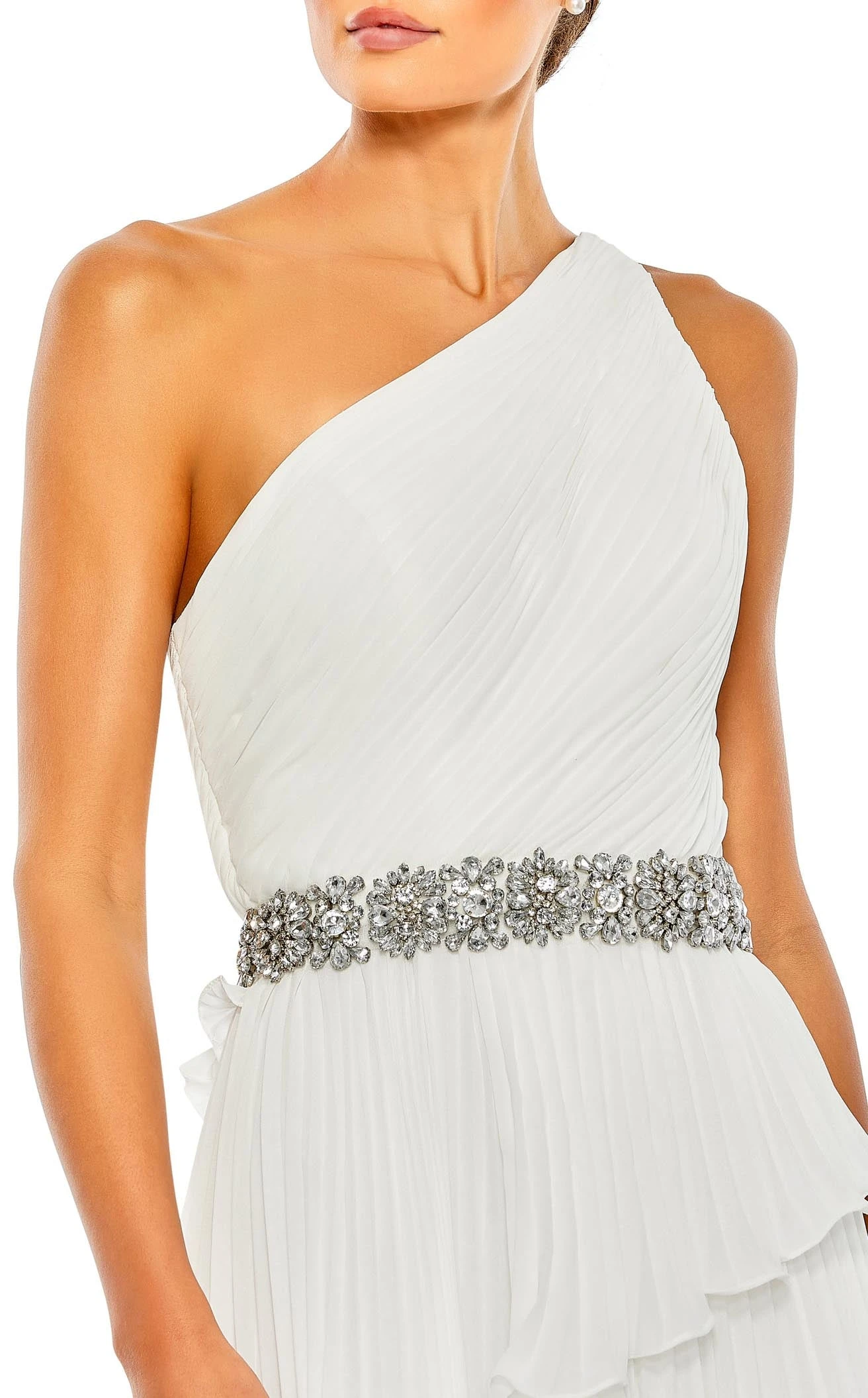 Dress up in this seductive outfit by Mac Duggal 49532. It has an asymmetrical neckline with an open back and zippered closure. The natural waistline is immersed with jewel detailing and marks the beginning of an asymmetrical ruffled skirt. This dress ends with a full-length hem and a subtle sweep train.