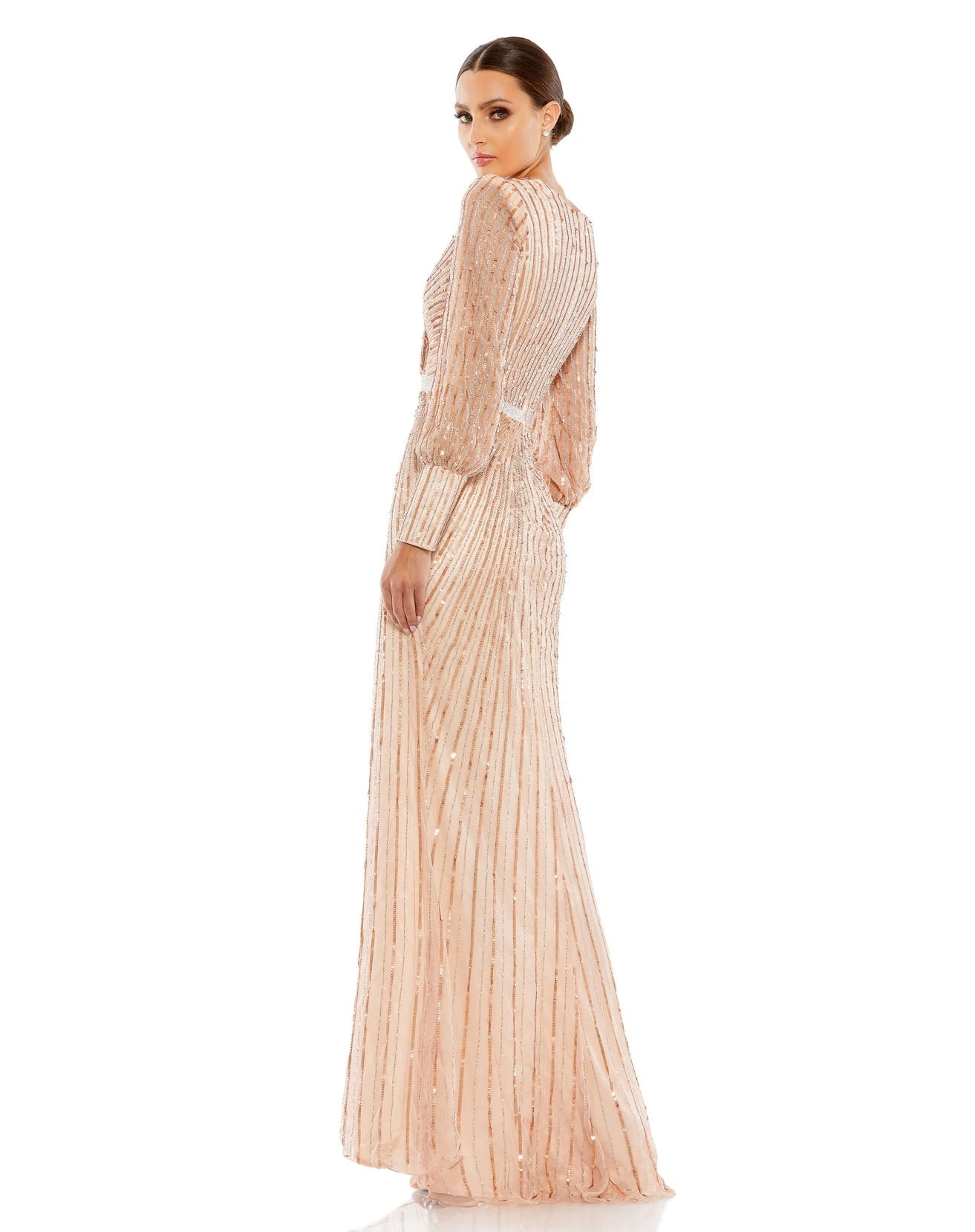 Show your prowess in this sheath dress by Mac Duggal 5501. It has a V-neckline, full-length bishop sleeves, and a zippered back. The natural waistline flaunts a sparkling belt while the silhouette looks glamorous with its sequin detailing. Featuring a sheath skirt and a court train, the dress makes your every move memorable.