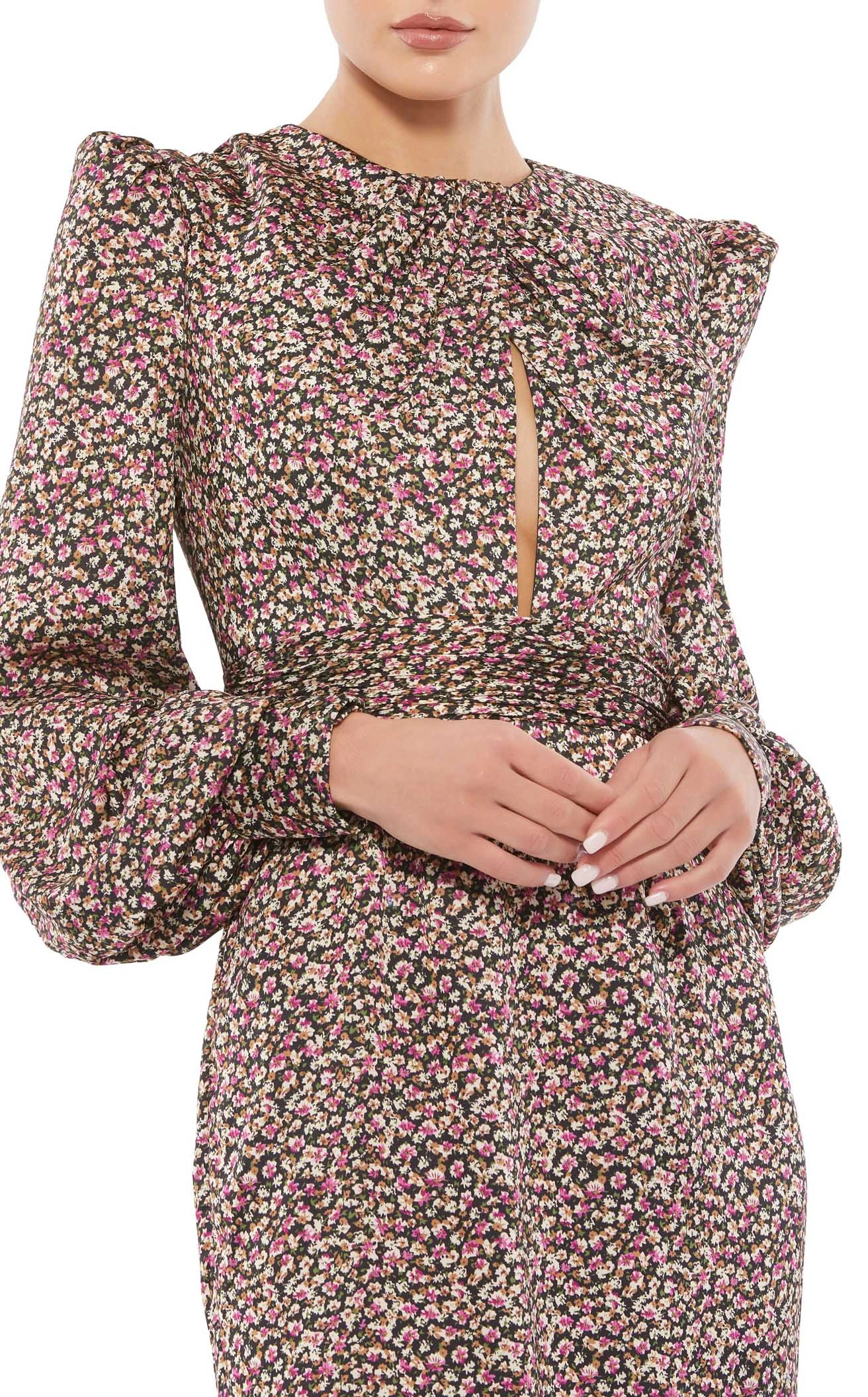 Classy and elegant, this floral number from Mac Duggal 55389 is sure to capture all the attention! The dress parades a cinched bodice, prettified with a classic jewel neckline, an alluring keyhole on the front and the bishop sleeves. The multi-colored floral print throughout the dress creates a visual spectacle. Flowing up to the thigh-high length hem, the dress visualizes a column silhouette.