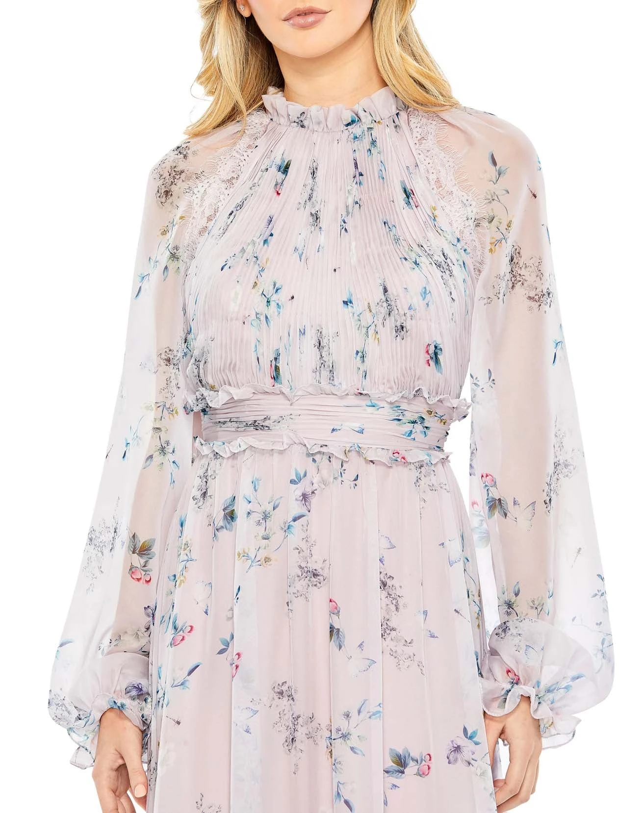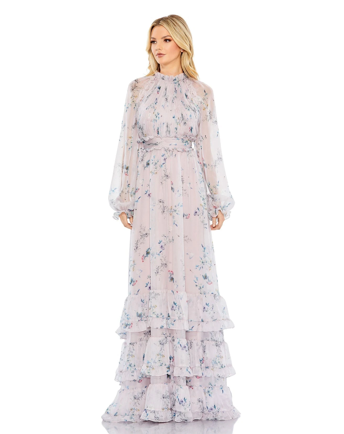 The bishop sheer sleeves, A-line ruffle layer dress by Mac Duggal 68199 is an amazing piece of attire. This is a sleeveless style that is perfect for any occasion. It has a ruched waistband and is layered. This floral printed dress is a perfect blend of elegance and femininity. It features a high neckline with a bishop sheer sleeve, ruching waistband, and an A-line skirt with a ruffle layer.
