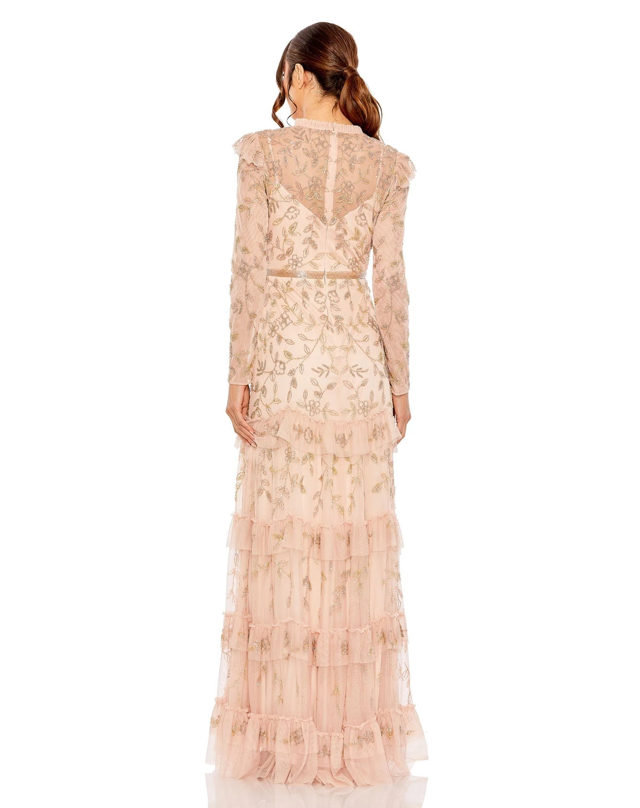 Illusion High Neckline Full Sleeve Ruffle Layer Dress by Mac Duggal