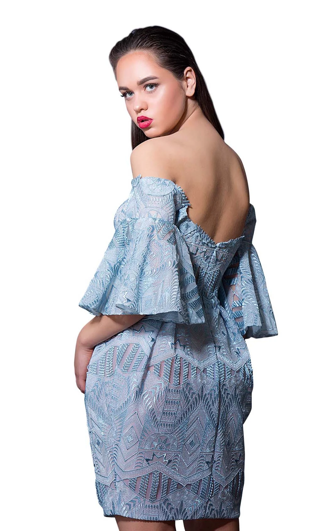 Fitted off-shoulder cocktail dress with short flowy sleeves by MNM Couture
