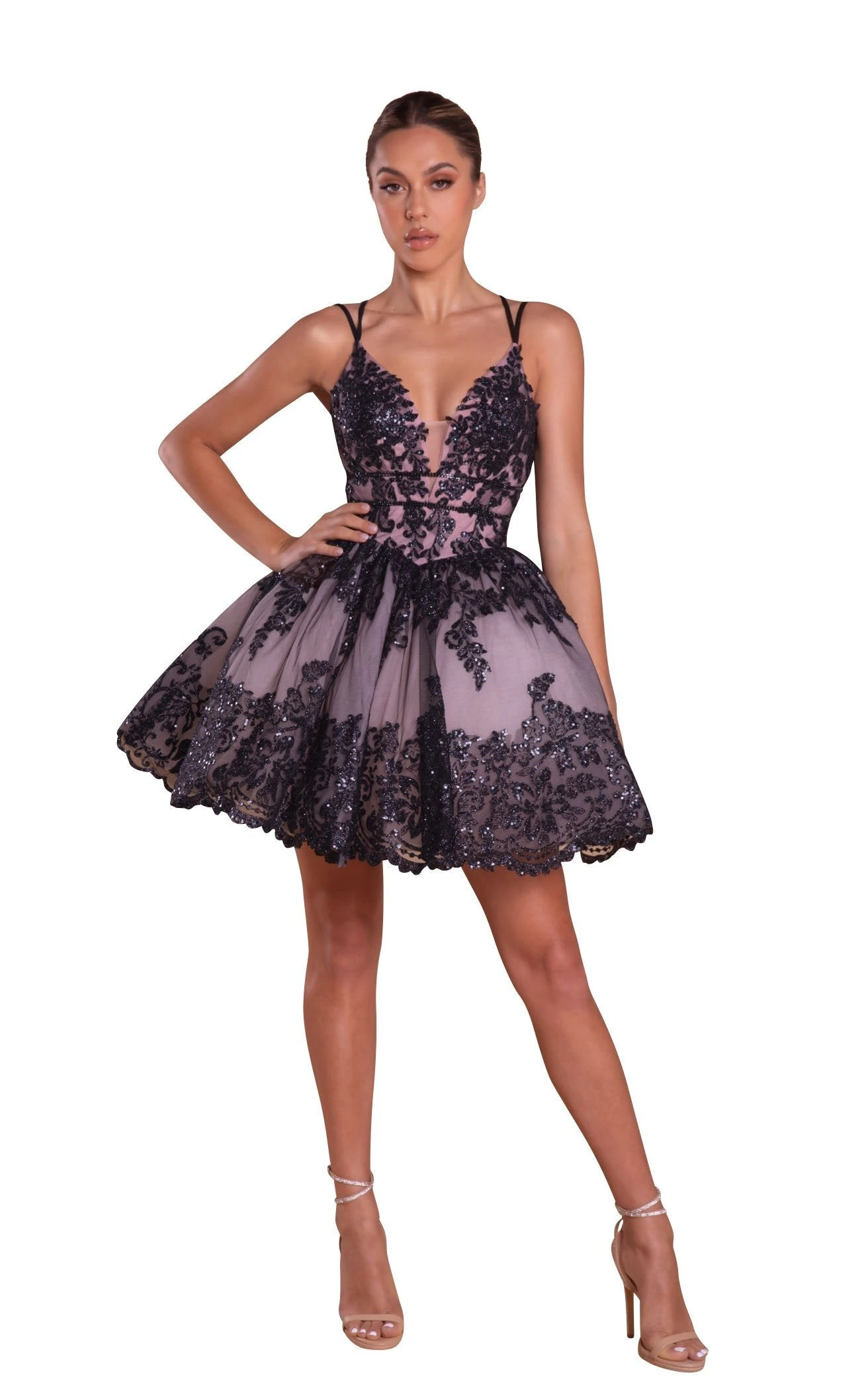 Wearing this lovely Portia and Scarlett PS21007 dress would leave a trail of admirers in your wake. In a sleeveless and appliqued bodice with a basque waist, this dress features a plunging V neckline supported by thin straps. The skirt has an A-line silhouette, with a crisscross back and lace-up back closure. This masterpiece would leave everyone gasping with admiration.