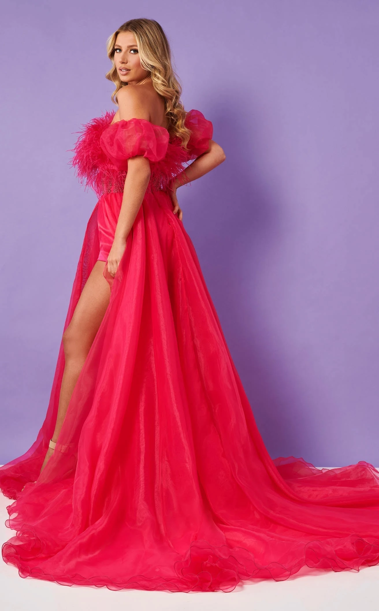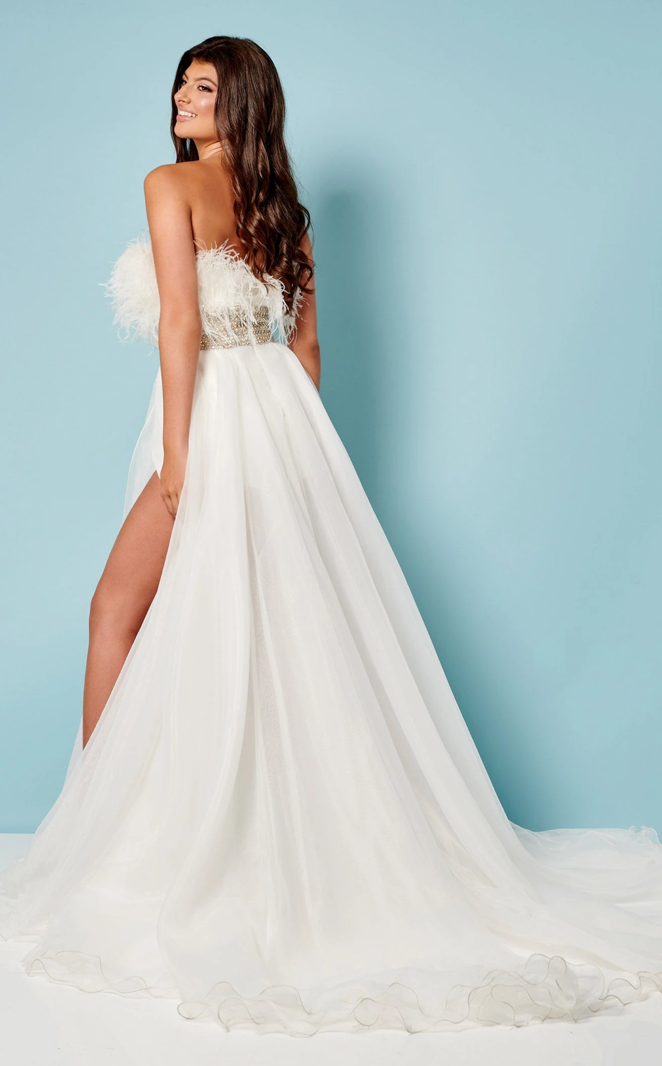 Pause the world around you wearing the beautiful dress by Rachel Allan 50205. Created with a flowy silhouette, the dress has a strapless construction neckline and feather trimmings. The overskirt gives a dramatic look along with a thigh-high slit. The trumpet skirt is trimmed with a slit that falls into the form of a train. Flaunt opulent beauty with this masterpiece.
