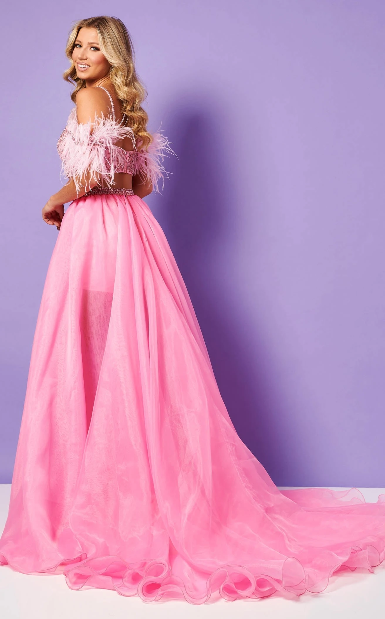 Amp-up your look by wearing this striking Rachel Allan 50222 cocktail dress. The two-piece dress features a detachable overskirt. The crop top features a sweetheart neckline and sleeveless construction with feathers at the quarter. The top and pants are embellished with intricate embroidery. Step out with confidence in this beautiful masterpiece.