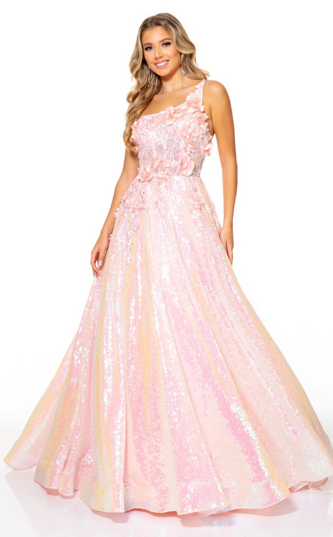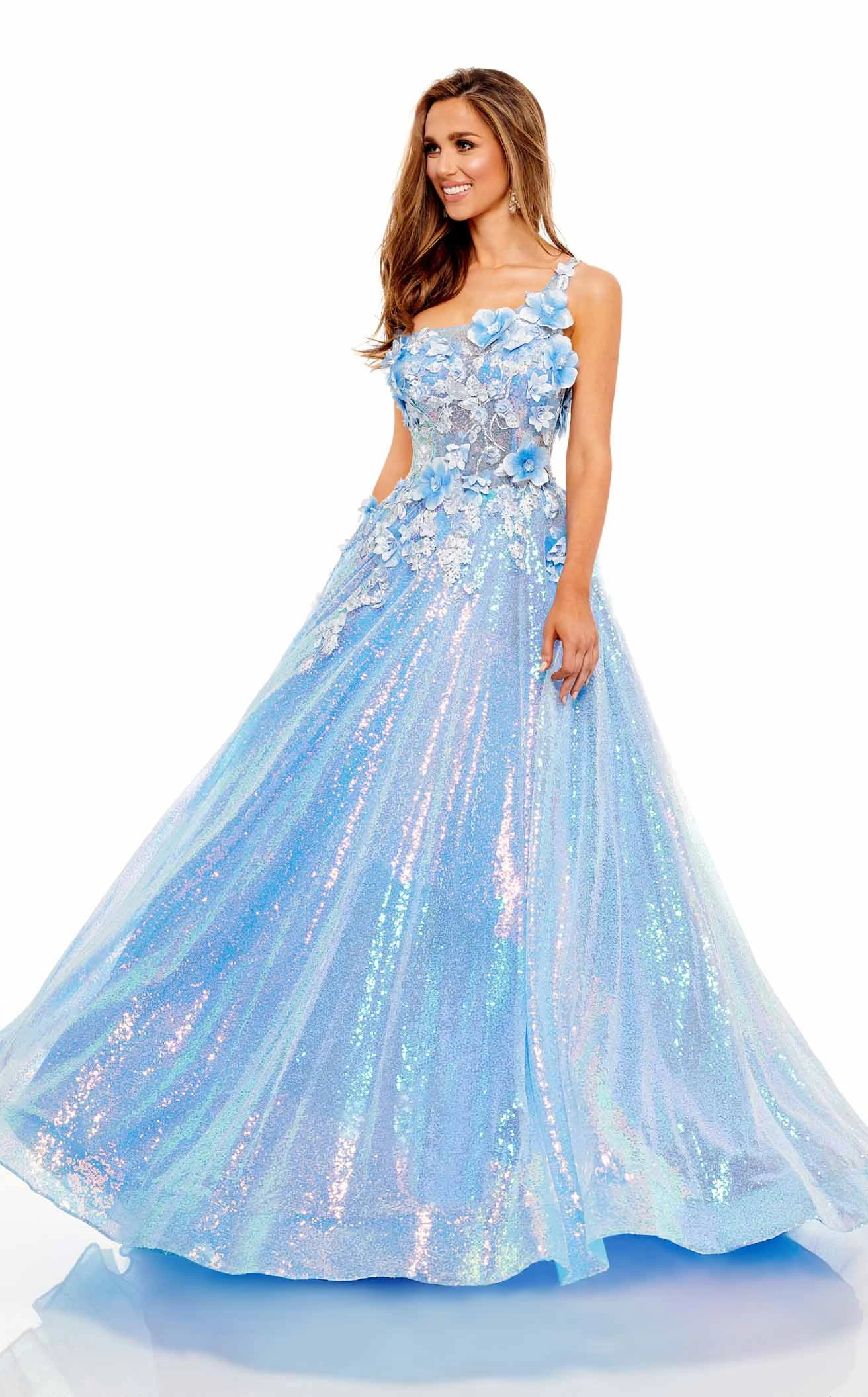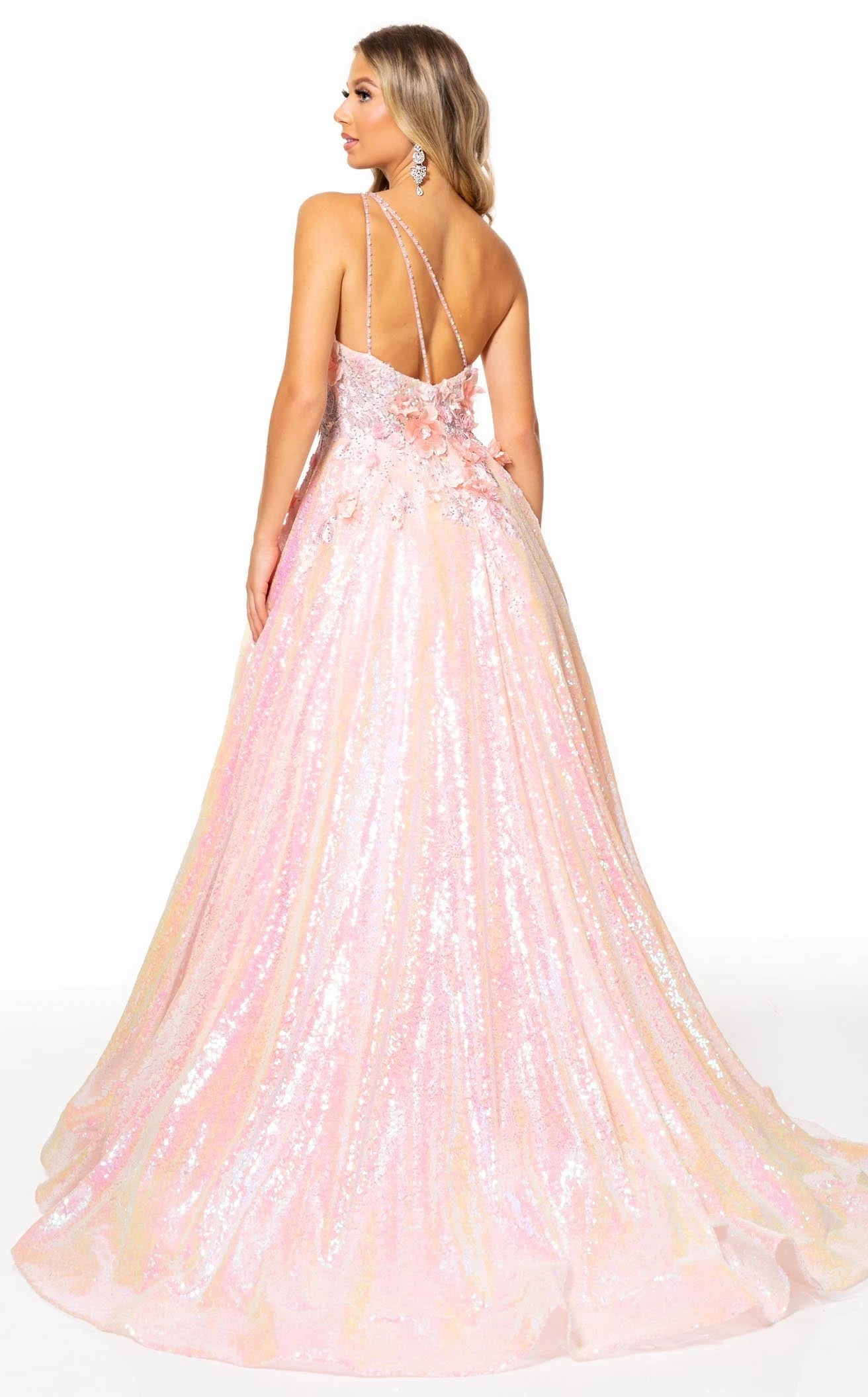 Get ready to dazzle the world with this dreamy dress designed by Rachel Allan 70267. The A-line silhouette of the dress is majestically voluminous. The soft tones along with the floral designs embedded on it make it extremely feminine. Sparkling with beauty and glitters, this dress is an exquisite creation worth trying.