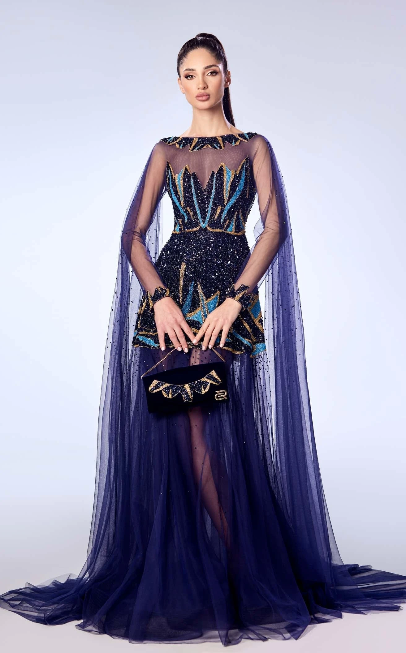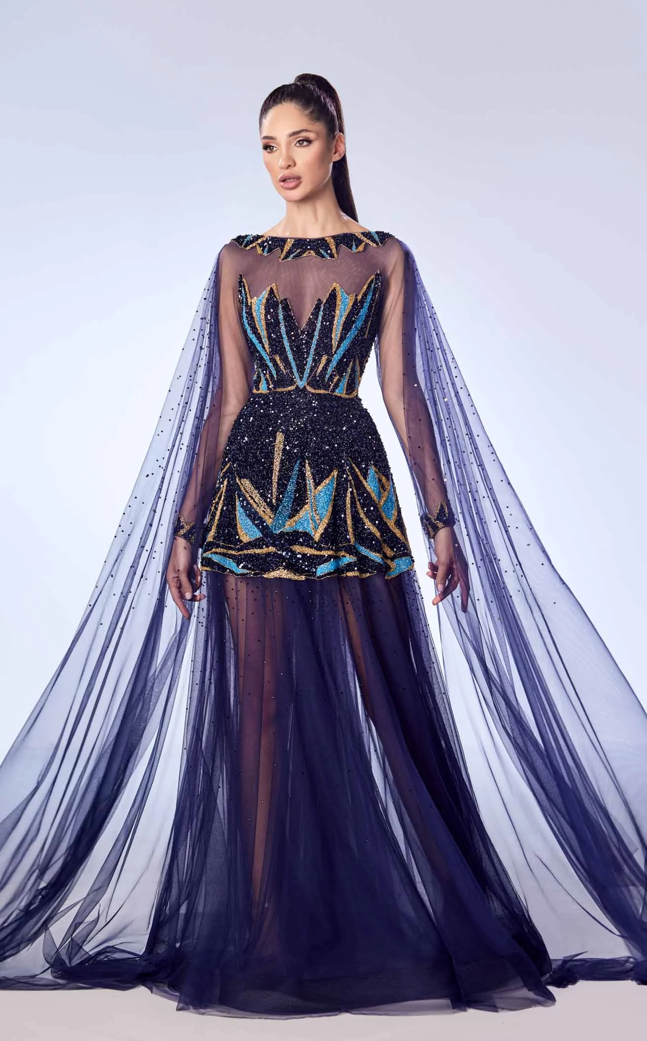 This mesh gown from Reverie Couture is a stunning piece that embodies sophistication and elegance. It has an A-line silhouette and ends in a dramatic chapel train. A patchwork short tunic lies under the mesh in a sweetheart neckline. The high neckline and full sleeves of the mesh are bordered with the same patchwork, and the dress features an elaborate cape to add more flair.