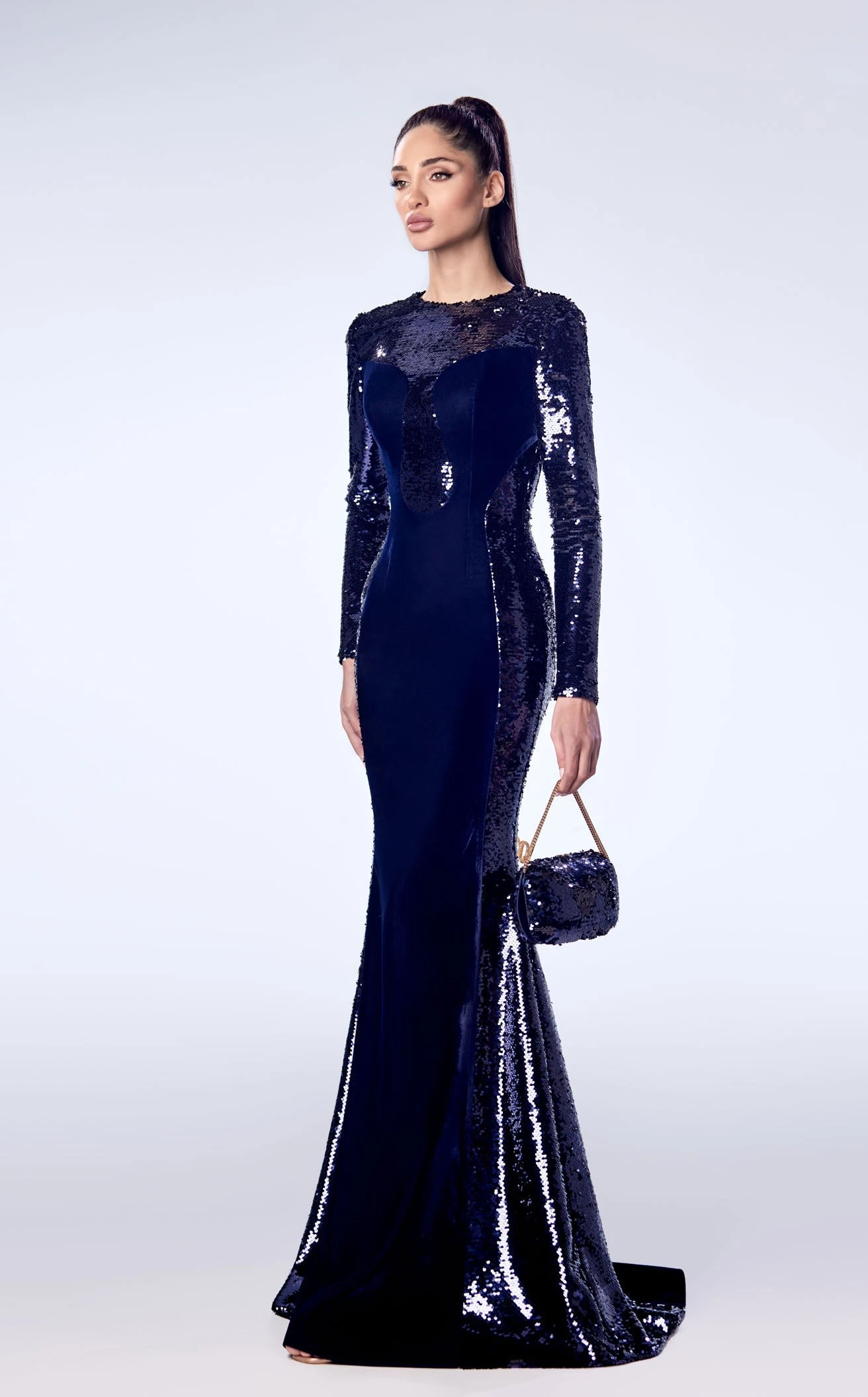 Shimmer and shine all night long in this exquisite mermaid gown by Reverie Couture. It has a high neckline and full sleeves covered in sequins for a sophisticated and elegant look. A velvet panel runs vertically between the sequins from top to bottom. This velvet panel has a sweetheart border at the top.