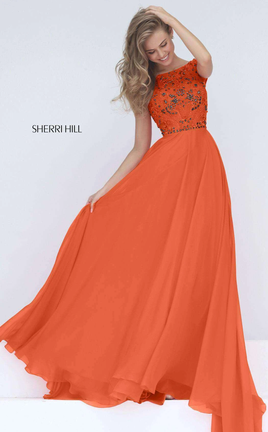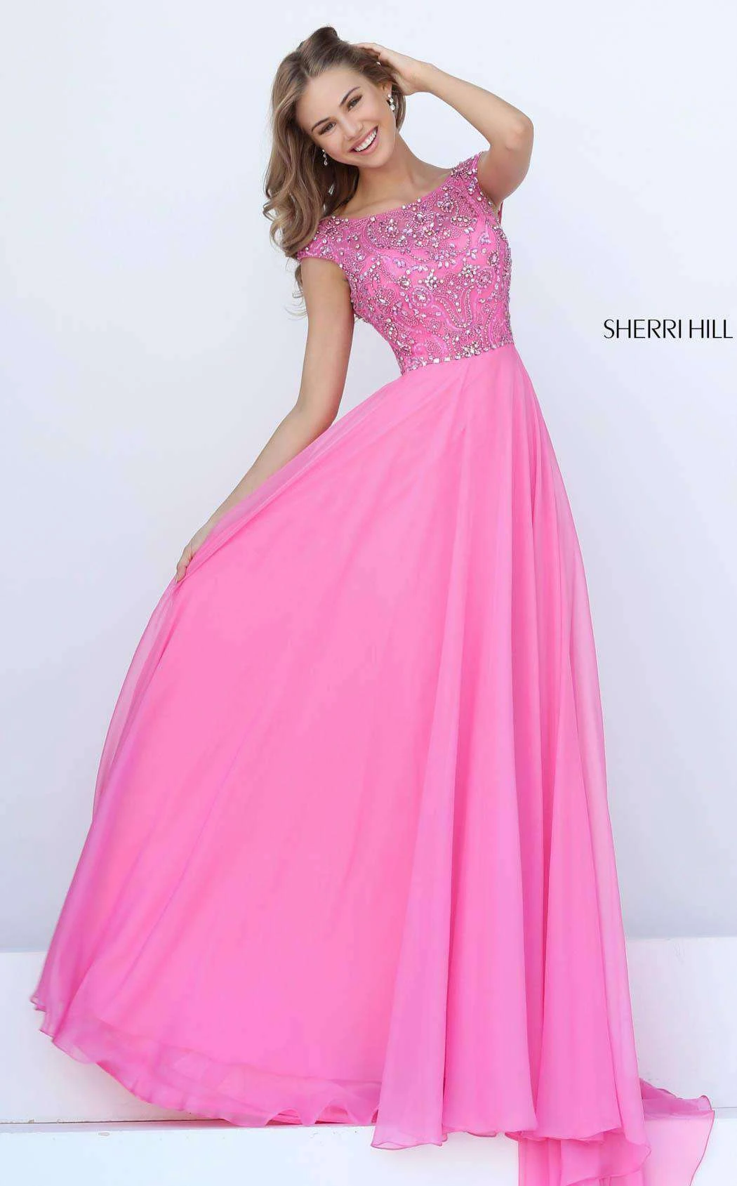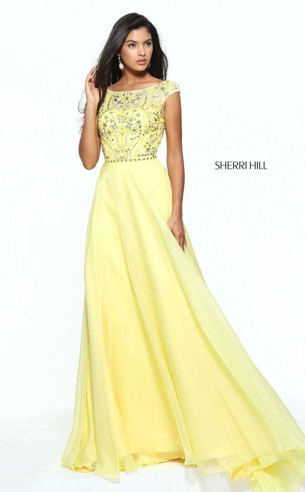 Cap sleeves and a twinkling bodice create an enchanting look for a very special night out in this perfect gown by Sherri Hill 50849. Below the natural waist line, the layers of a full length skirt end in a stylish sweep train.