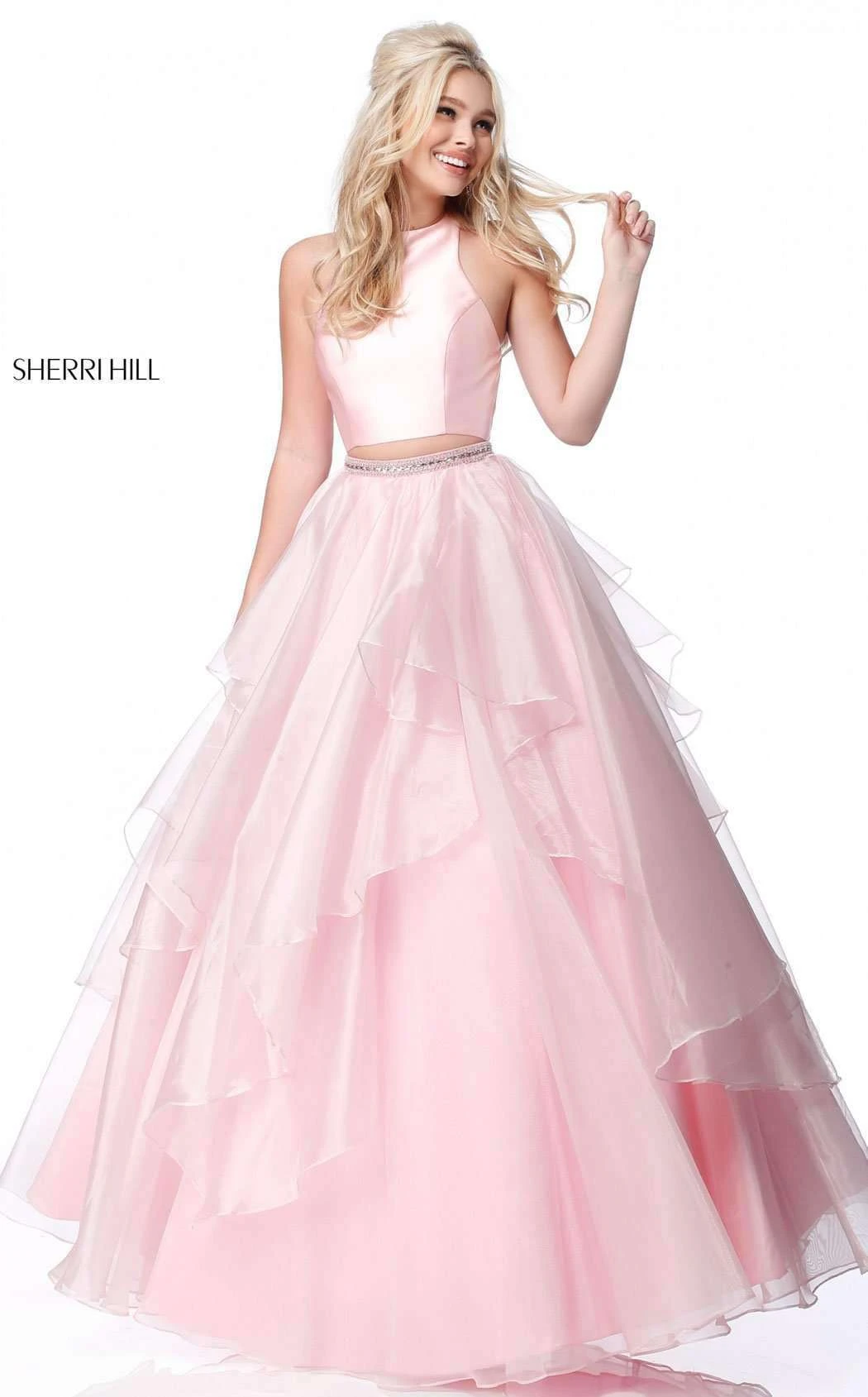 A smooth halter top starts the exquisite look of this special evening ready look by Sherri Hill 51960. A sparkling waist line borders the wispy, asymmetrical layers of the full A line skirt.