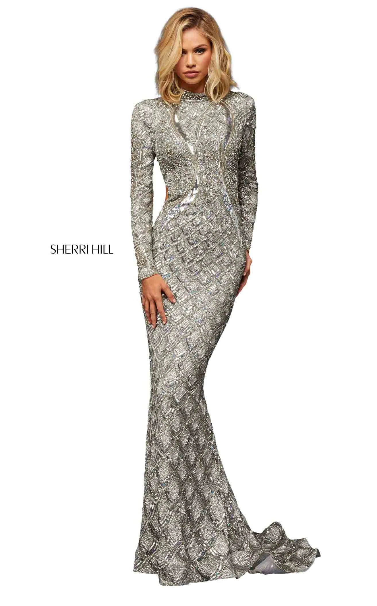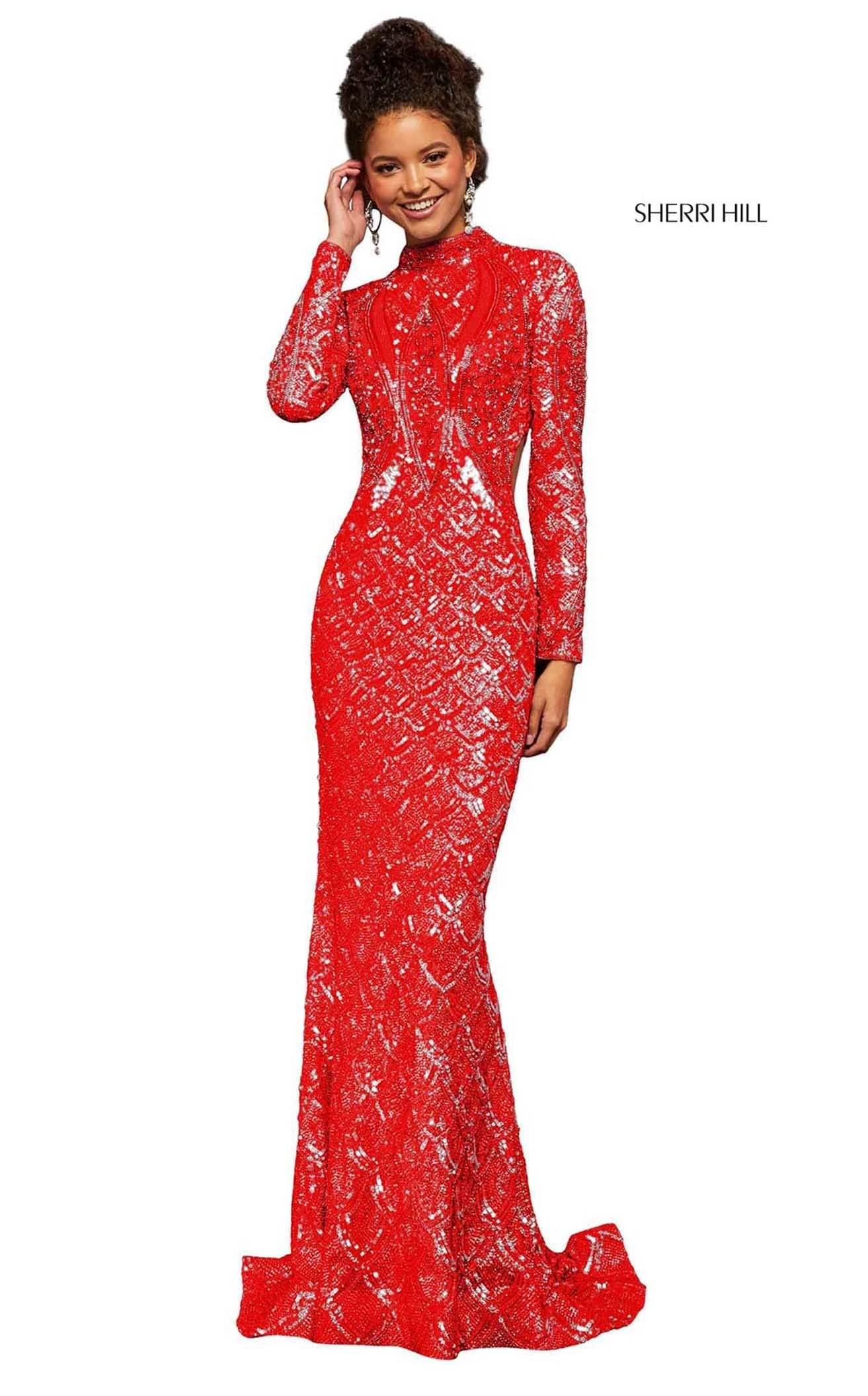 Look amazing at your next big event in this fabulous evening gown designed by Sherri Hill 52916. Featuring a high neckline on the long-sleeved fitted bodice, this gown makes way for a partially open back with side cutouts. The beaded gown traces your natural curves and falls into a small sweeping train to complete the look.