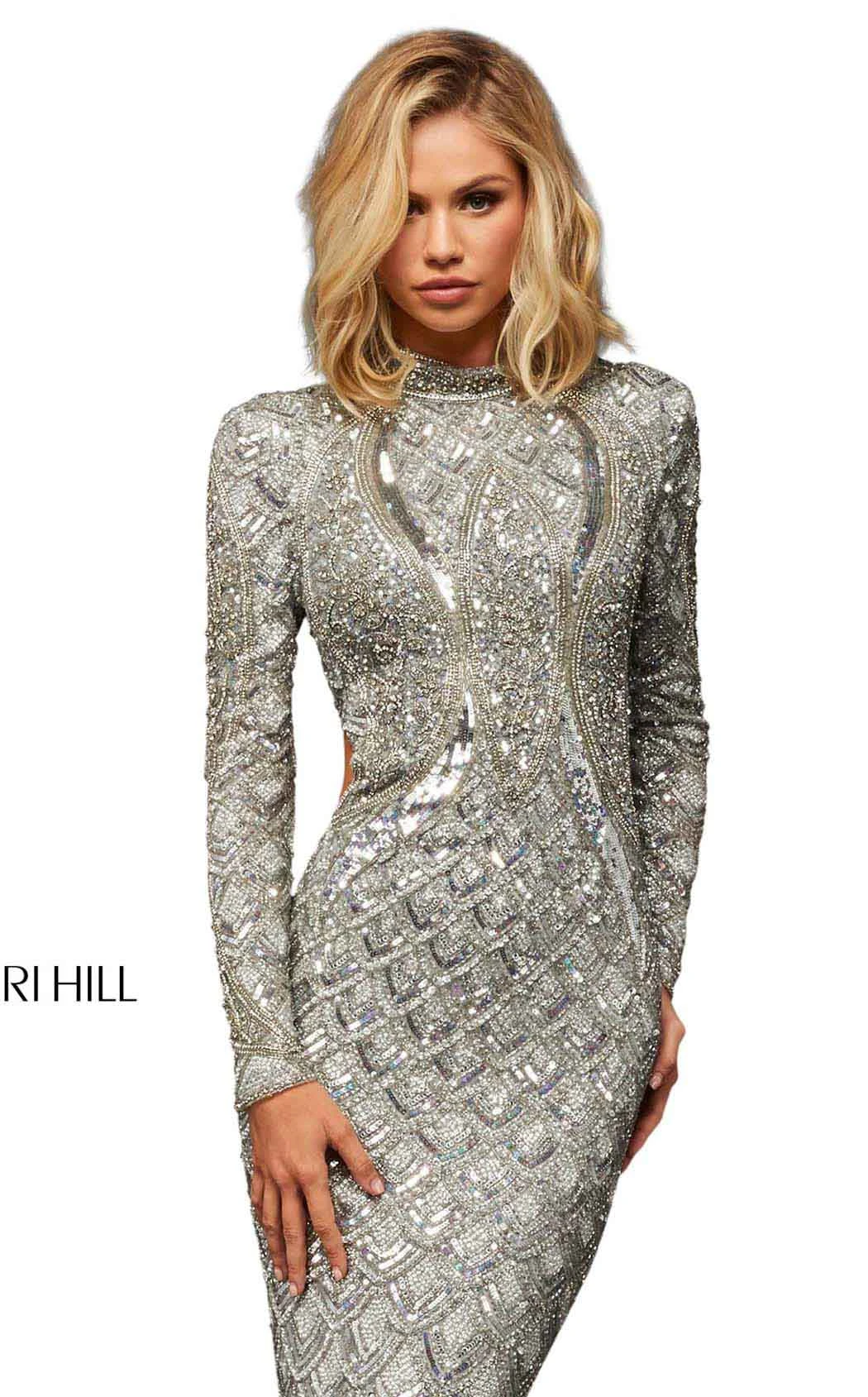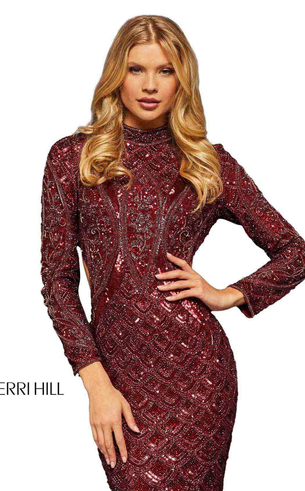 Beaded high neck sheath gown with long sleeves and open back by Sherri Hill