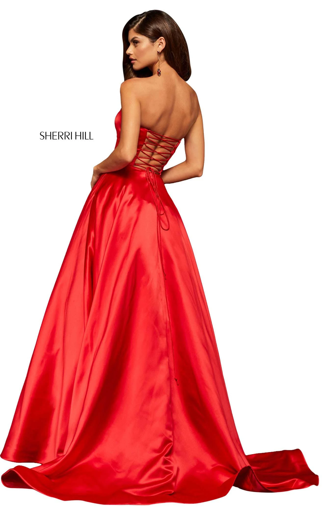 This gown from Sherri Hill 52924 is perfect if you want a dress for more than one occasion. Featuring a strapless fitted bodice, the dress has a straight-across neckline that leads to the corset-style lace-up open back. The A-line silhouette of the gown flares from the waistline into a floor-length skirt that ends with a sweeping train.