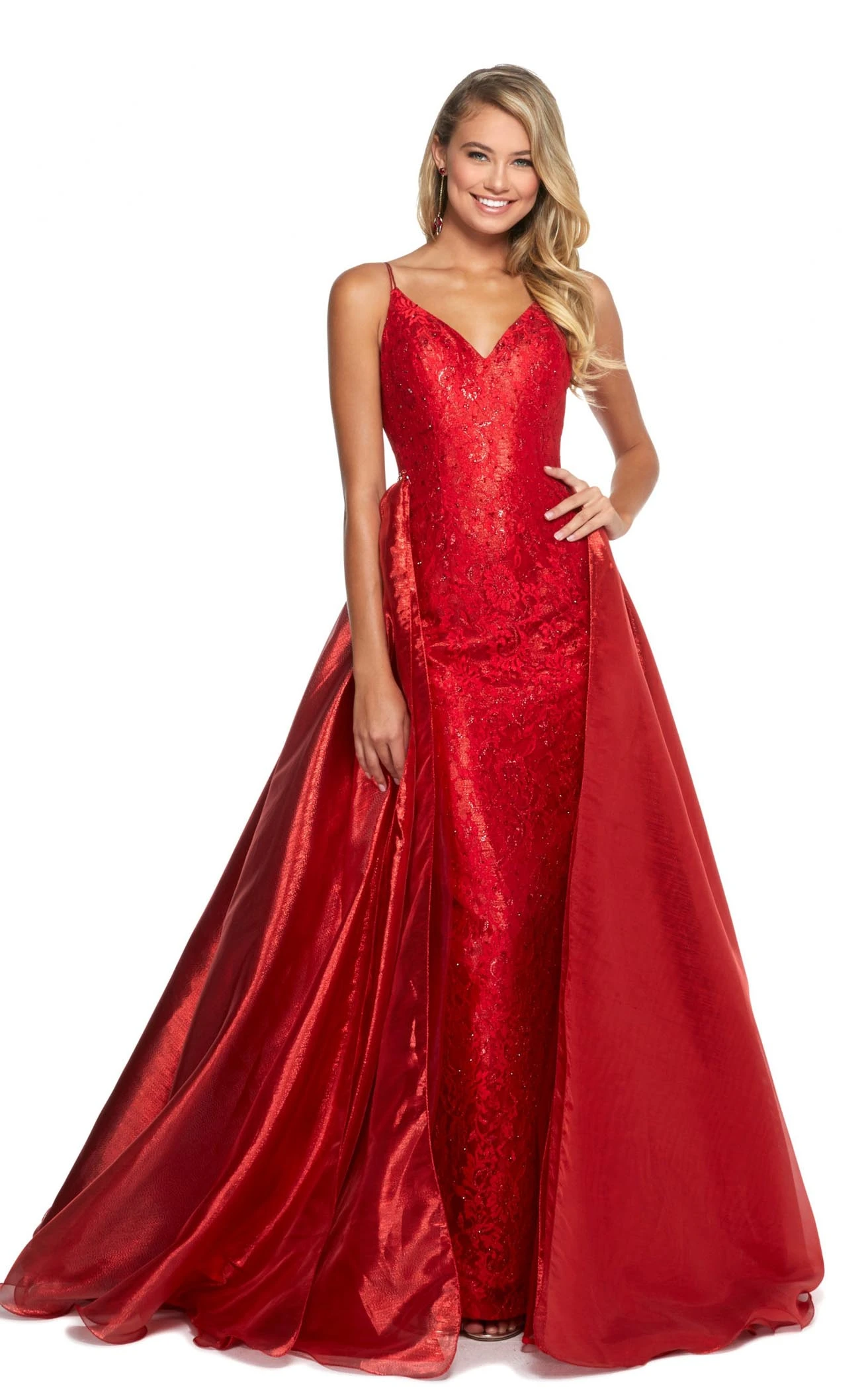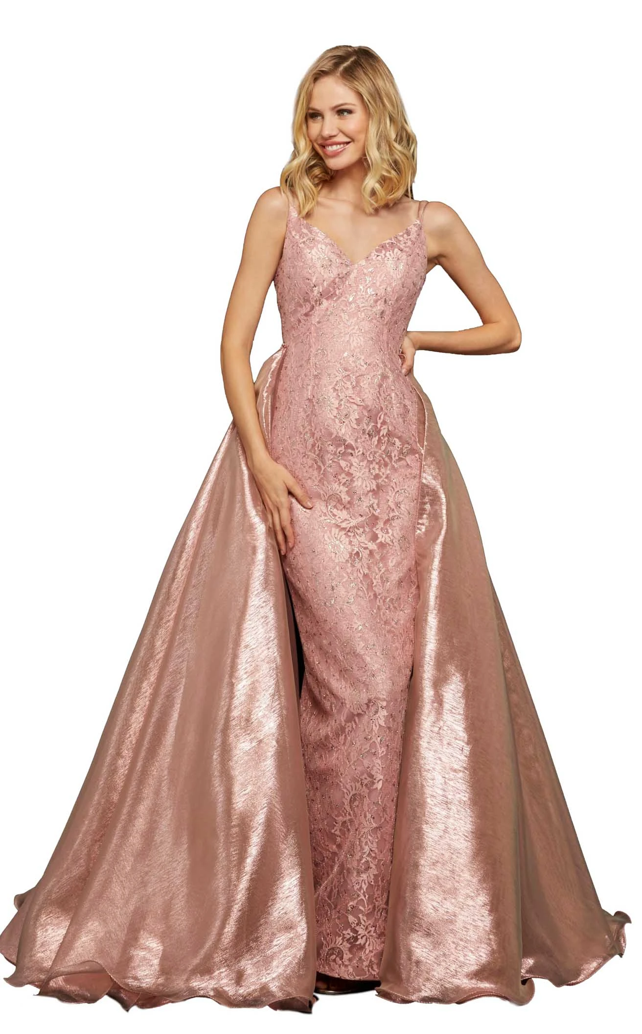 Set a stellar precedent in this blush celebrity-style evening gown by Sherri Hill. Satiny shoulder straps debut the sweetheart bodice, and tailoring lines define a curvy fit from the bust through the hips. Lacy layering lends a savvy sense of depth along the bodice and full-length skirt. A satiny, open overskirt flares from the waist to the feet.