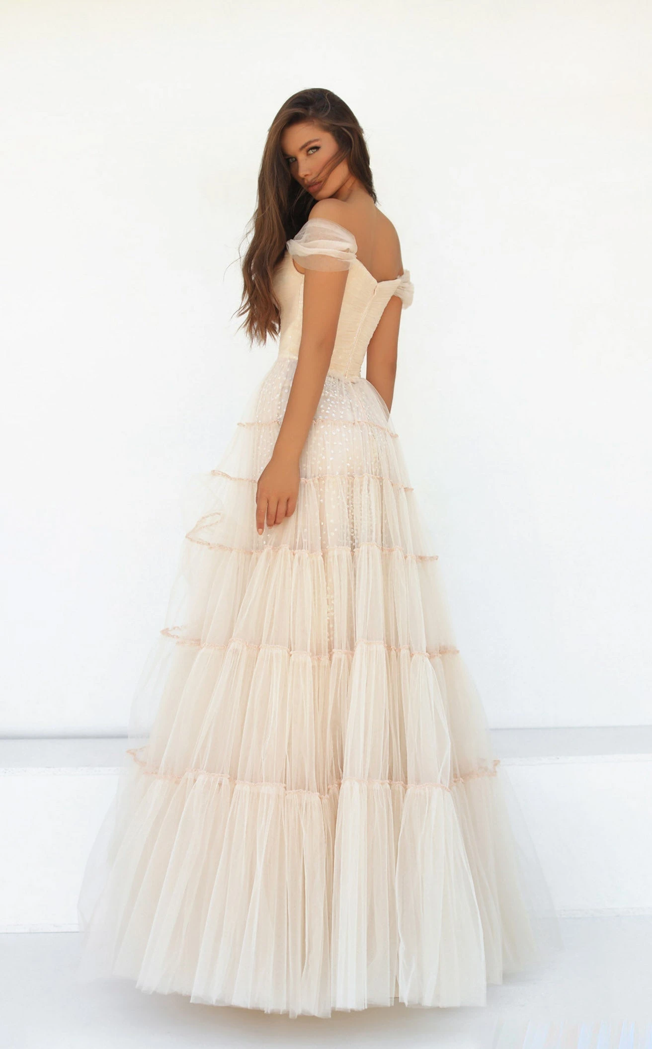 If you’re a simple and sophisticated person, this dress by Tarik Ediz 98090 is the perfect one for you. The lovely A-line silhouette cascading below the waist flourishes to the floor showing it’s subtle embellishments in a full-length hem and a sweep train. The corset torso showcases a straight across neckline, off shoulder cap sleeves divert the attention to your beautifully structured face.