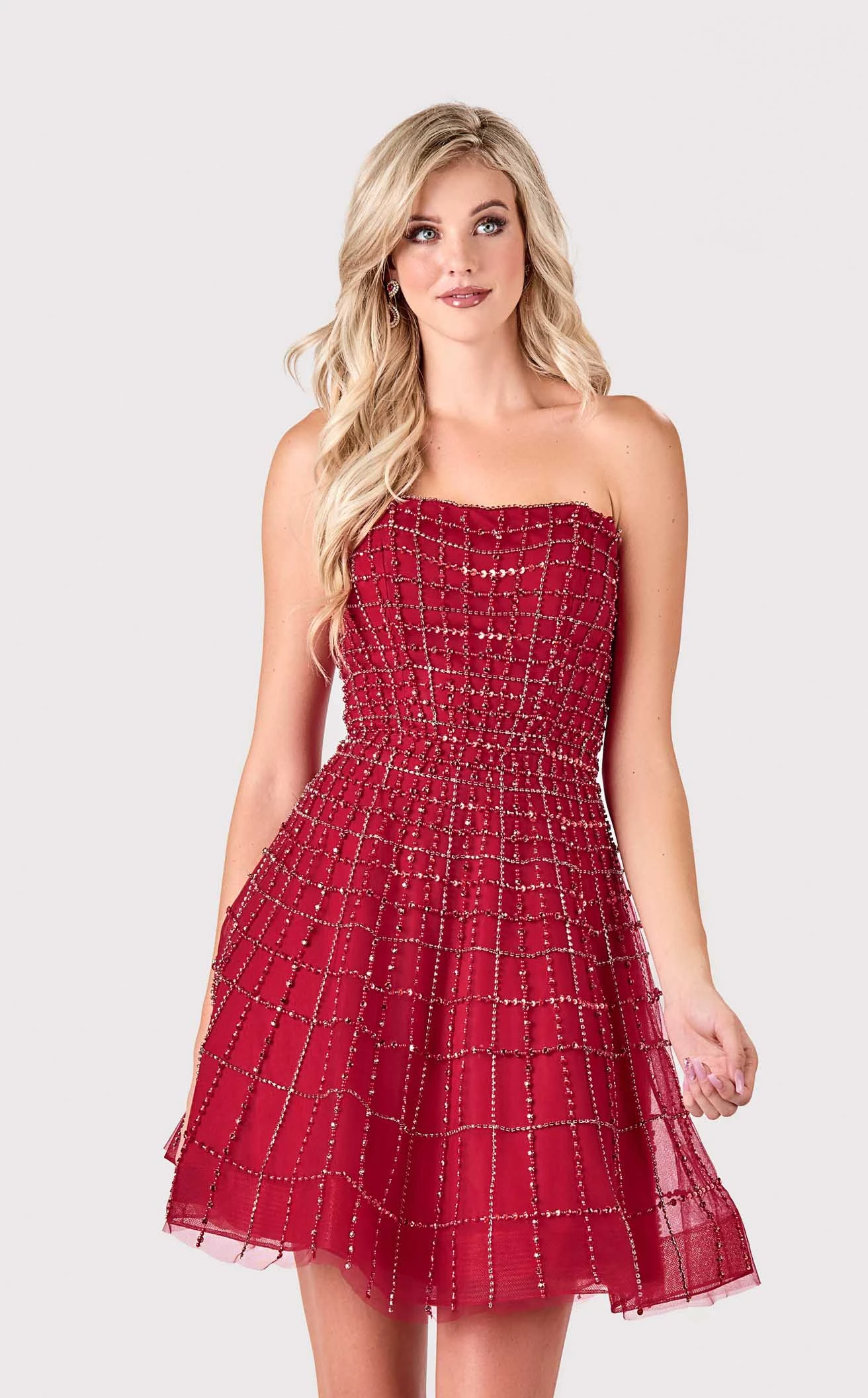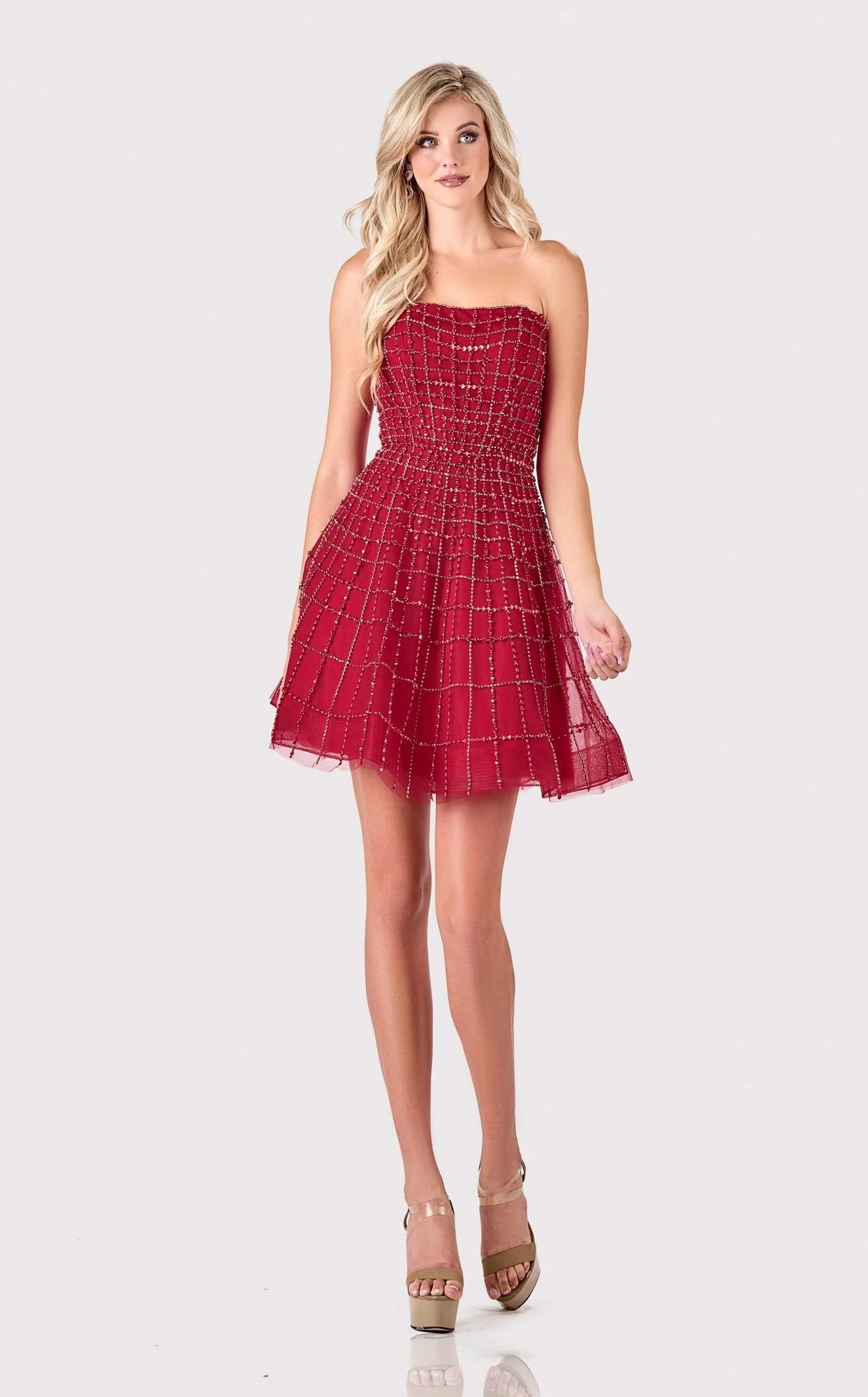 Look absolutely pretty in Terani 2111P4250 Dress. This sublime piece features a a-line silhouette and glittering accents. The sleeveless bodice has a strapless neckline and a natural waist.