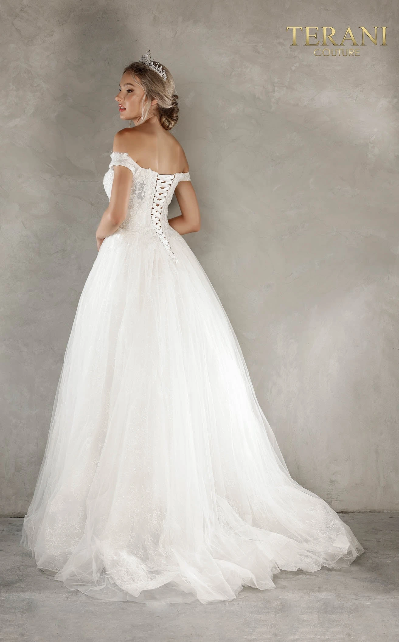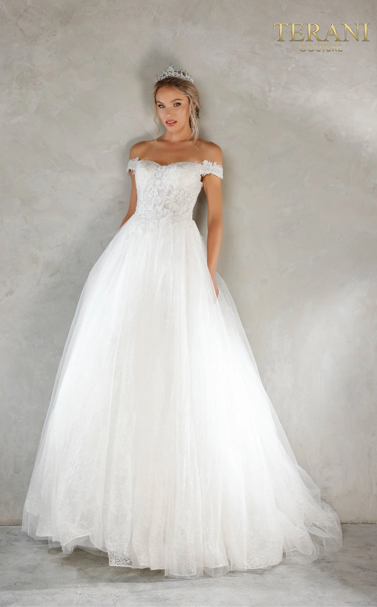 Look exquisite in this statement ball gown by Terani 2215P0034. The dress allows you to look tall in an extravagant A-silhouette ina. full-length hem and a lavish sweeping train. An off shoulder sleeve with a sweetheart neckline defines your collarbones and structured shoulders. The dress shows off its embroidered details on the corset torso making you look absolutely angelic.