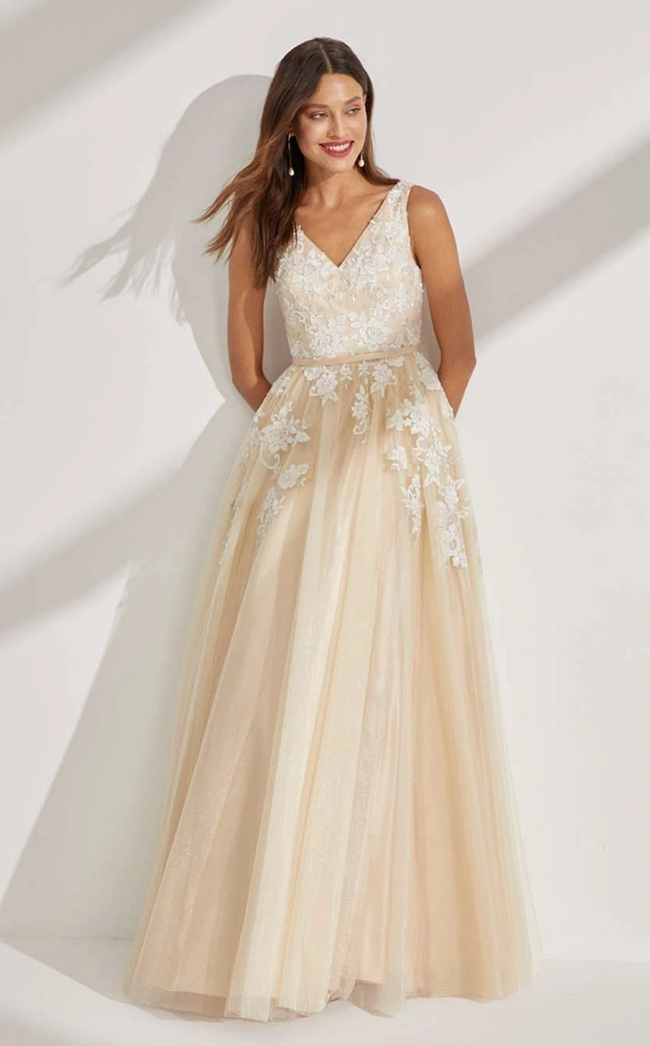 Walk with grace in a feminine evening gown designed by Tiara TAB2026115 featuring an Embroidered Fluffy Skirt. The long gown comes with a deep V-neckline and sleeveless bodice adorned with lace and 3D floral embellishments. A slender belt gives way to a gorgeous A-line skirt with a fluffy silhouette creating a perfect appeal for a ball dance.